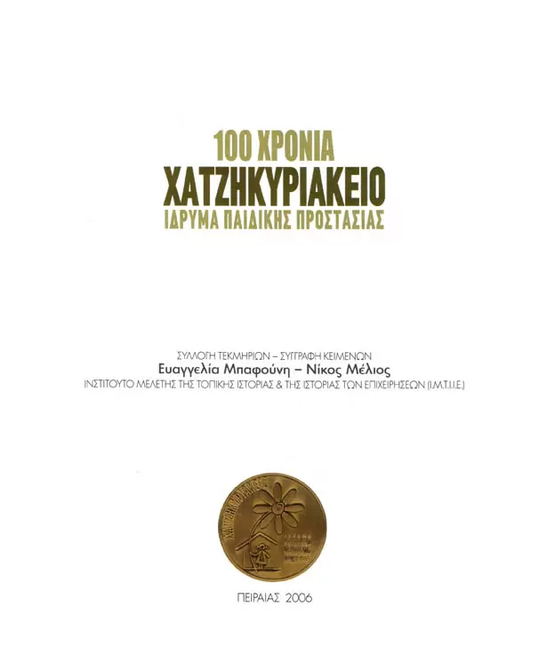 100 χρόνια Χατζηκυριάκειο Ίδρυμα Παιδικής Προστασίας / Ευαγγελία Μπαφούνη, Νίκος Μέλιος · επιμέλεια Ευαγγελία Μπαφούνη, Νίκος Μέλιος. – 1η έκδ. – Πειραιάς : Ινστιτούτο Μελέτης της Τοπικής Ιστορίας και της Ιστορίας των Επιχειρήσεων (Ι.Μ.Τ.Ι.Ι.Ε.), Χατζηκυριάκειο Ίδρυμα Παιδικής Προστασίας, 2006. – 196σ. · 28×24εκ.