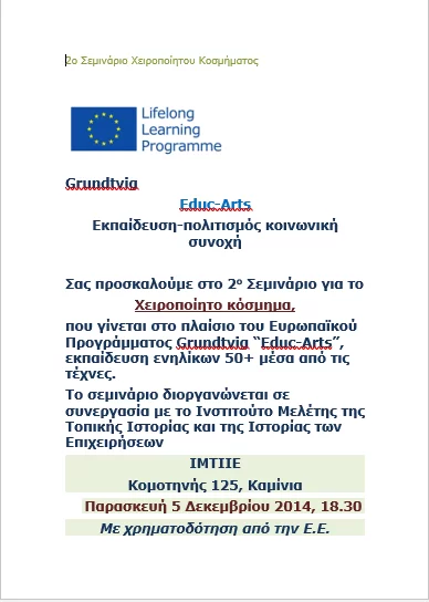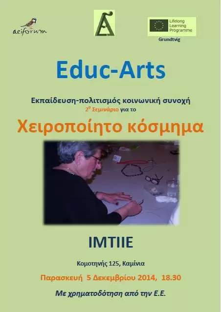 Το Ι.Μ.Τ.Ι.Ι.Ε. συμμετείχε στο πλαίσιο του Ευρωπαϊκού Προγράμματος Δια Βίου Μάθησης Grundtvig “Educ-Arts” στην υλοποίηση δράσεων με στόχο τη βελτίωση της κατάρτισης των ενηλίκων και την κοινωνική ένταξη των ατόμων άνω των 50 που έχουν περιθωριοποιηθεί λόγω της ανεργίας, της φτώχειας ή συνταξιοδότησης. Το κύριο εργαλείο για το σκοπό αυτό ήταν μια σειρά μαθημάτων κατάρτισης και εργαστηρίων δημιουργικής απασχόλησης στον τομέα του πολιτισμού. Το τελικό προϊόν του Προγράμματος το οποίο σχεδίασε και ολοκλήρωσε το Aeiforum ήταν ένα Εγχειρίδιο Εκπαίδευσης Ενηλίκων για τον Πολιτισμό. Οι εταίροι οργάνωσαν μια σειρά από εργαστήρια κατάρτισης σχετικά με βασικούς πολιτιστικούς τομείς, όπως: αφήγηση (μύθος και τη δημιουργία ιστορίας), πλαστικές τέχνες (γλυπτική, κεραμική), θέατρο, κατασκευή απλών μουσικών οργάνων, εκμάθηση των χορών και παραδοσιακή κουζίνα. Για αναλυτικότερες πληροφορίες για το πρόγραμμα βλέπε εδώ.
