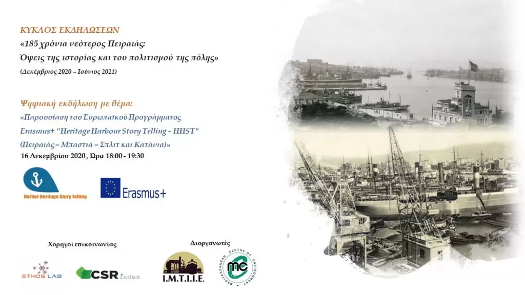 Στο πλαίσιο αυτό, διοργανώνει σε συνεργασία με το Μεσογειακό Κέντρο Περιβάλλοντος, στις 16 Δεκεμβρίου 2020 και ώρα 18:00, Ψηφιακή Εκδήλωση με θέμα: «Παρουσίαση του Ευρωπαϊκού Προγράμματος Erasmus+ “Heritage Harbour Story Telling – HHST” (Πειραιάς – Μπαστιά – Σπλιτ και Κατάνια)».