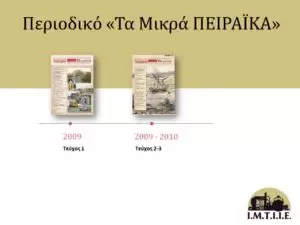 «Το Ινστιτούτο Μελέτης της Τοπικής Ιστορίας και της Ιστορίας των Επιχειρήσεων (Ι.Μ.Τ.Ι.Ι.Ε. ) προχώρησε στην έκδοση του δεύτερου περιοδικού του με τίτλο Τα μικρά Πειραϊκά. Δεν είναι εύκολο πράγμα η έκδοση ενός περιοδικού και ειδικά σε καιρούς χαλεπούς, όταν μάλιστα εκκρεμεί η έκδοση του τρίτου τεύχους του επιστημονικού του περιοδικού Πειραϊκά.