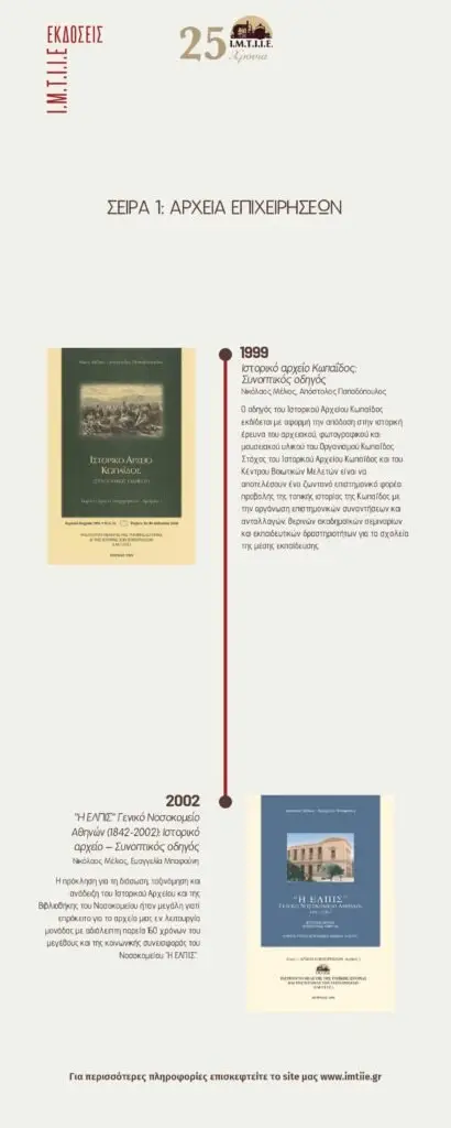 Ιστορικό αρχείο Κωπαΐδος: Συνοπτικός οδηγός / Νικόλαος Μέλιος, Απόστολος Παπαδόπουλος. – 1η έκδ. – Πειραιάς: Ινστιτούτο Μελέτης της Τοπικής Ιστορίας και της Ιστορίας των Επιχειρήσεων (Ι.Μ.Τ.Ι.Ι.Ε.), 1999. – 46σ. · 22×15εκ. – (Αρχεία Επιχειρήσεων · 1) ISBN 960-7975-03-0, ISBN-13 978-960-7975-03-4 (Μαλακό εξώφυλλο) [Κυκλοφορεί]