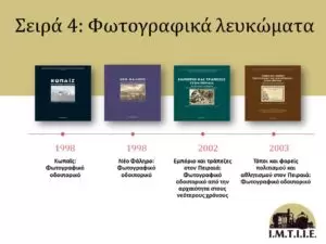 Εμπόριο και τράπεζες στον Πειραιά: Φωτογραφικό οδοιπορικό από την αρχαιότητα στους νεότερους χρόνους / Συλλογικό έργο, Νικόλαος Μέλιος, Ευαγγελία Μπαφούνη, Γεώργιος Σταϊνχάουερ. – 1η έκδ. – Πειραιάς: Ινστιτούτο Μελέτης της Τοπικής Ιστορίας και της Ιστορίας των Επιχειρήσεων (Ι.Μ.Τ.Ι.Ι.Ε.), 2002. – 142σ. · 22×22εκ. Περιέχει βιβλιογραφία ISBN 960-7975-07-3, ISBN-13 978-960-7975-07-2 (Μαλακό εξώφυλλο) [Κυκλοφορεί]
