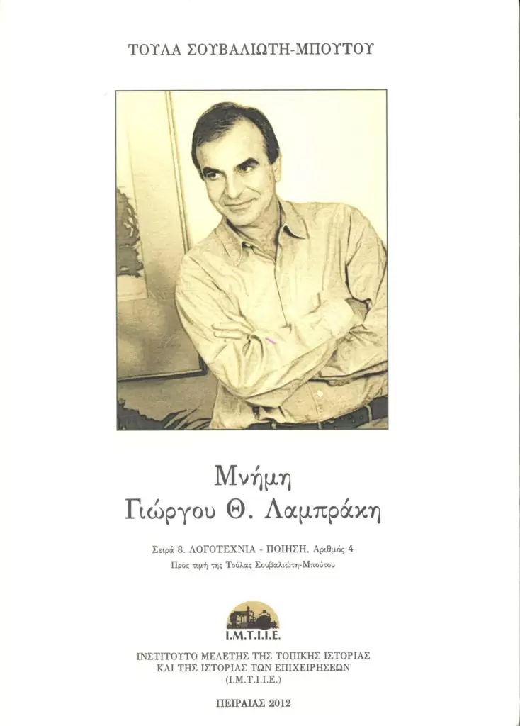 Μνήμη Γιώργου Θ. Λαμπράκη / Τούλα Σουβαλιώτη – Μπούτου. – 1η έκδ. – Πειραιάς: Ινστιτούτο Μελέτης της Τοπικής Ιστορίας και της Ιστορίας των Επιχειρήσεων (Ι.Μ.Τ.Ι.Ι.Ε.), 2012. – 80σ. · 21×14εκ. – (Λογοτεχνία: Ποίηση · 4) ISBN 978-960-7975-22-5 (Μαλακό εξώφυλλο) [Κυκλοφορεί]