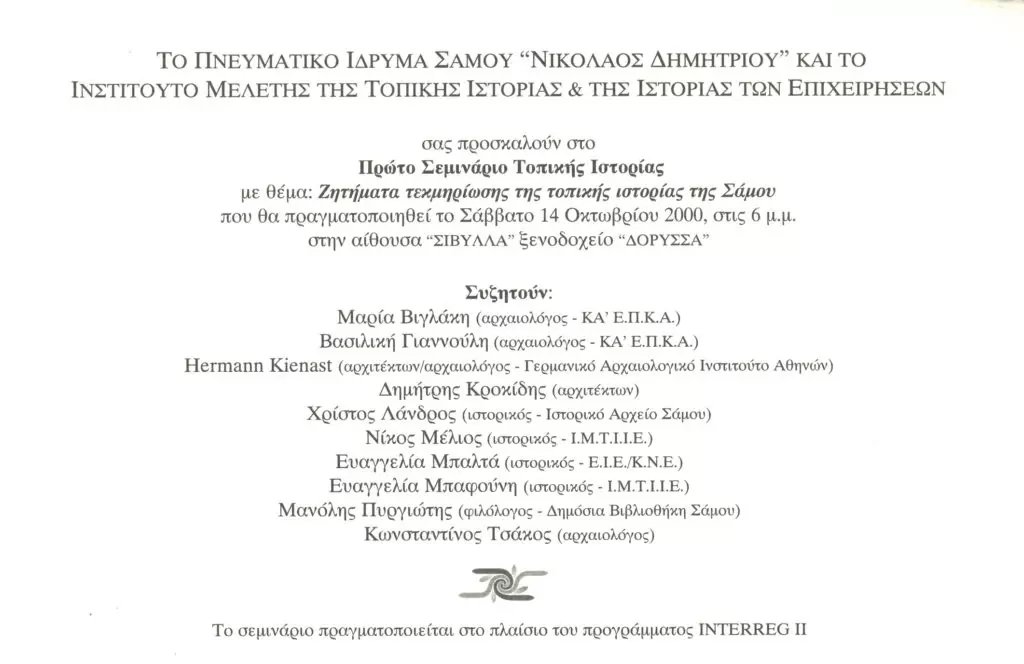 • Πρώτο Σεμινάριο Τοπικής Ιστορίας με θέμα «Ζητήματα τεκμηρίωσης της τοπικής ιστορίας της Σάμου» (Πνευματικό Ίδρυμα Σάμου «ΝΙΚΟΛΑΟΣ ΔΗΜΗΤΡΙΟΥ») (14 Οκτωβρίου 2000)