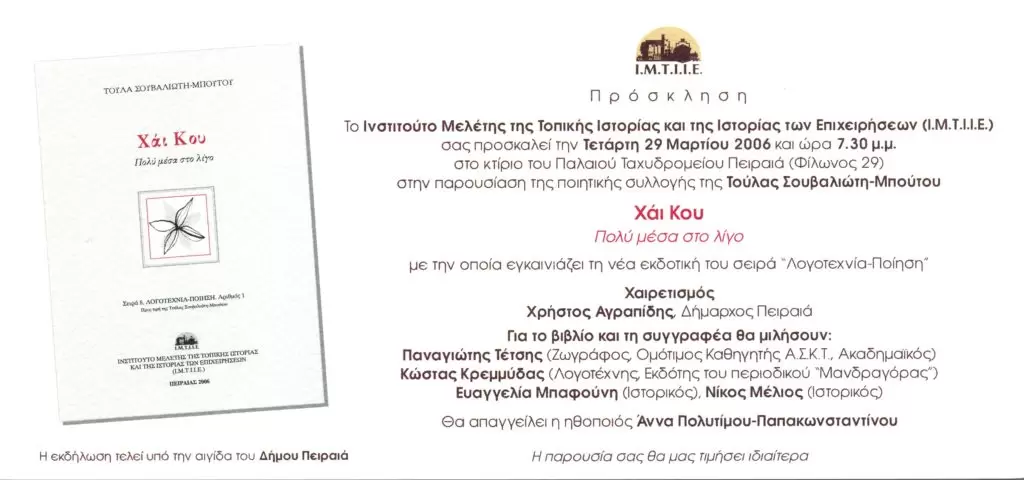• Παρουσίαση της ποιητικής συλλογής της Τούλας Σουβαλιώτη-Μπούτου «Χάι Κου: Πολύ µέσα στο λίγο»  µε την οποία το Ι.Μ.Τ.Ι.Ι.Ε. εγκαινίασε τη νέα εκδοτική του σειρά «Λογοτεχνία-Ποίηση» (Παλαιό Ταχυδρομείο Πειραιά) (29 Μαρτίου 2006).