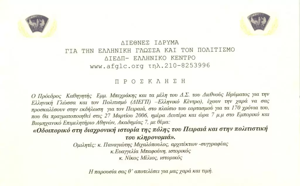 • Συμμετοχή στην εκδήλωση του Διεθνούς Ιδρύματος για την Ελληνική Γλώσσα και τον Πολιτισμό (ΔΙΕΓΠ – ΕΛΛΗΝΙΚΟ ΚΕΝΤΡΟ) για τον εορτασμό των 170 χρόνων της πόλης του Πειραιά θέμα: «Οδοιπορικό στη διαχρονική ιστορία της πόλης του Πειραιά και στην πολιτιστική του κληρονομιά» . (Εμπορικό & Βιομηχανικό Επιμελητήριο Αθηνών) (26 Μαρτίου 2006).
