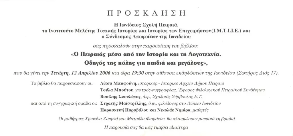 • Παρουσίαση του βιβλίου «Ο Πειραιάς μέσα από την ιστορία και τη λογοτεχνία. Οδηγός της πόλης για παιδιά και μεγάλους». (Ιωνίδειος) (12 Απριλίου 2006)