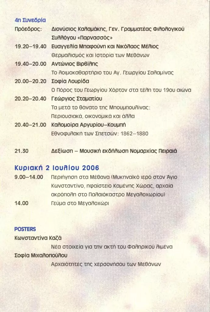 • Συμμετοχή στο Β’ Διεθνές Συνέδριο Ιστορίας και Αρχαιολογίας του Αργοσαρωνικού το οποίο διοργάνωσαν η Νομαρχία Πειραιά, ο Δήμος Μεθάνων και η ΚΣΤ’ Εφορεία Αρχαιοτήτων. (Μέθανα) (30 Ιουνίου – 2 Ιουλίου 2006)
