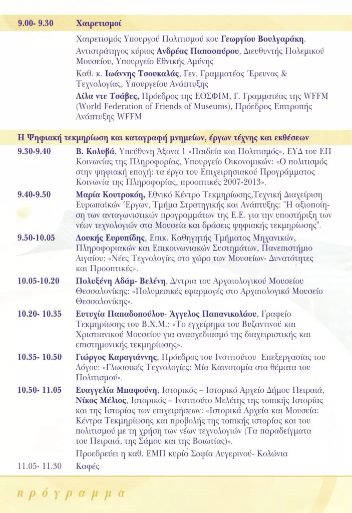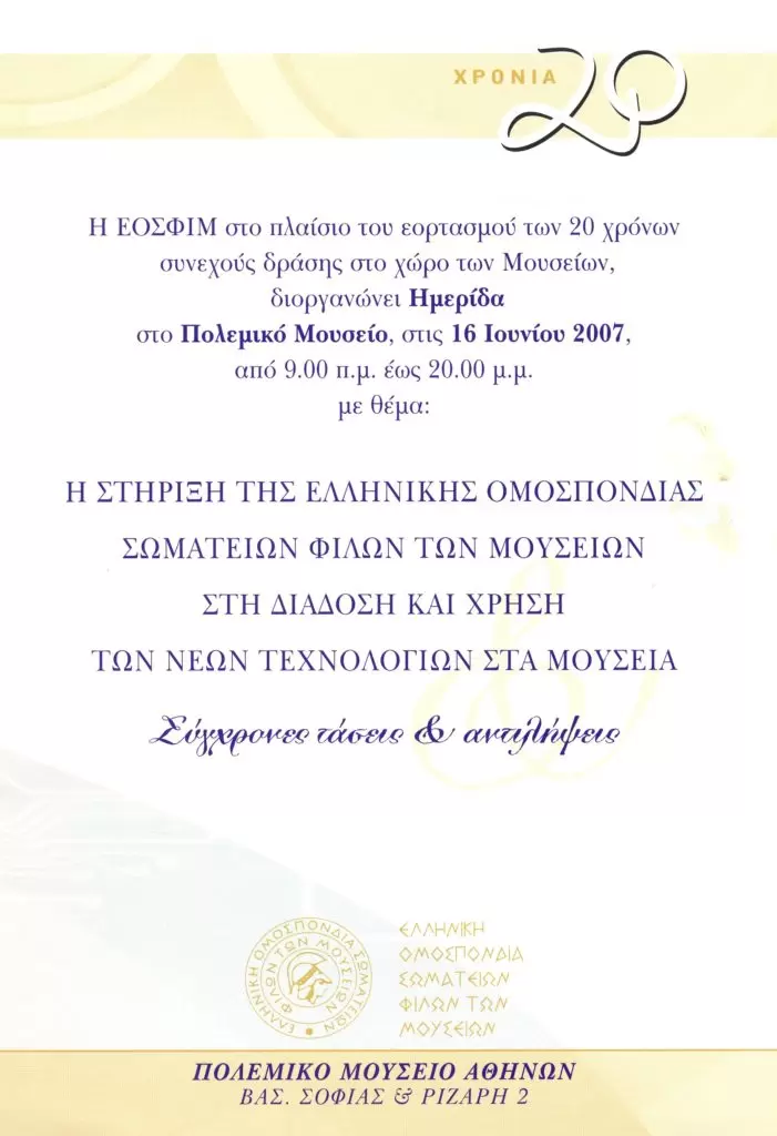 • Συμμετοχή στην Ημερίδα την οποία διοργάνωσε ο ΕΟΣΦΙΜ στο πλαίσιο του εορτασμού των 20 χρόνων συνεχούς δράσης στο χώρο των Μουσείων με θέμα «Η στήριξη της Ελληνικής Ομοσπονδίας Σωματείων Φίλων των Μουσείων στη διάδοση των νέων τεχνολογιών στα μουσεία: Σύγχρονες τάσεις και αντιλήψεις». (Πολεμικό Μουσείο Αθηνών) (16 Ιουνίου 2007)