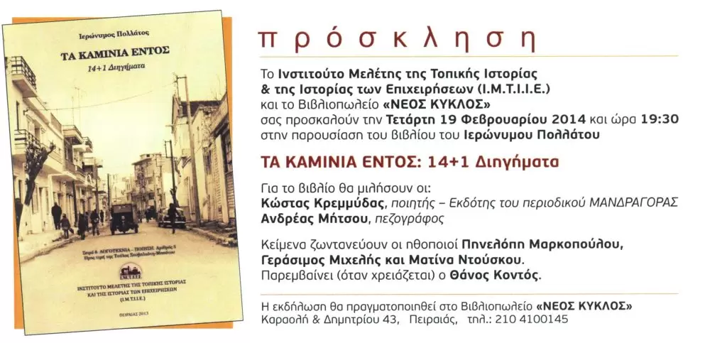 • Παρουσίαση του βιβλίου του Ι. Πολλάτου «Τα Καμίνια εντός (14+1 διηγήματα)» που εκδόθηκε από το Ι.Μ.Τ.Ι.Ι.Ε. (Βιβλιοπωλείο ΝΕΟΣ ΚΥΚΛΟΣ – Πειραιάς) (19 Φεβρουαρίου 2014)
